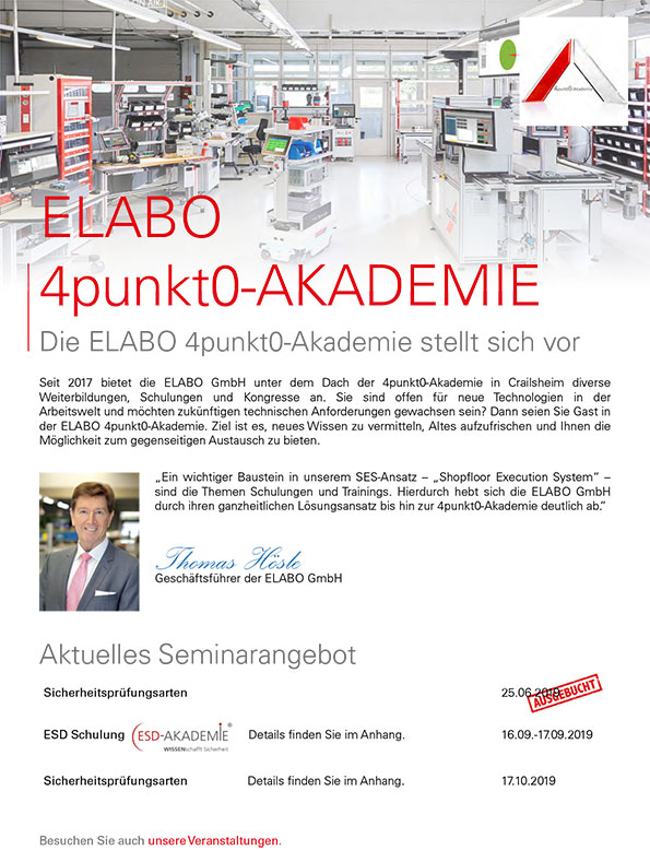 Aus diesem Anlass ist die ELABO 4punkt0-Akademie entstanden. Unter dem Slogan „Trainings für Menschen mit Ideen“ veranstaltet ELABO zahlreiche Schulungen und Veranstaltungen. Ziel ist es, Neues zu vermitteln, Altes aufzufrischen und Ihnen die Möglichkeiten zum gegenseitigen Austausch zu bieten.